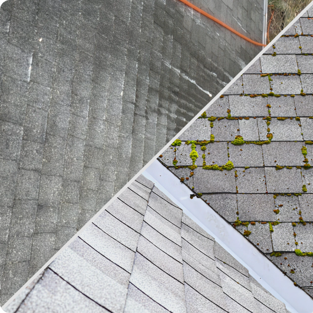 We safely eliminate algae, moss, and black streaks using a low-pressure wash that protects your roofing materials while restoring a clean, like-new look.